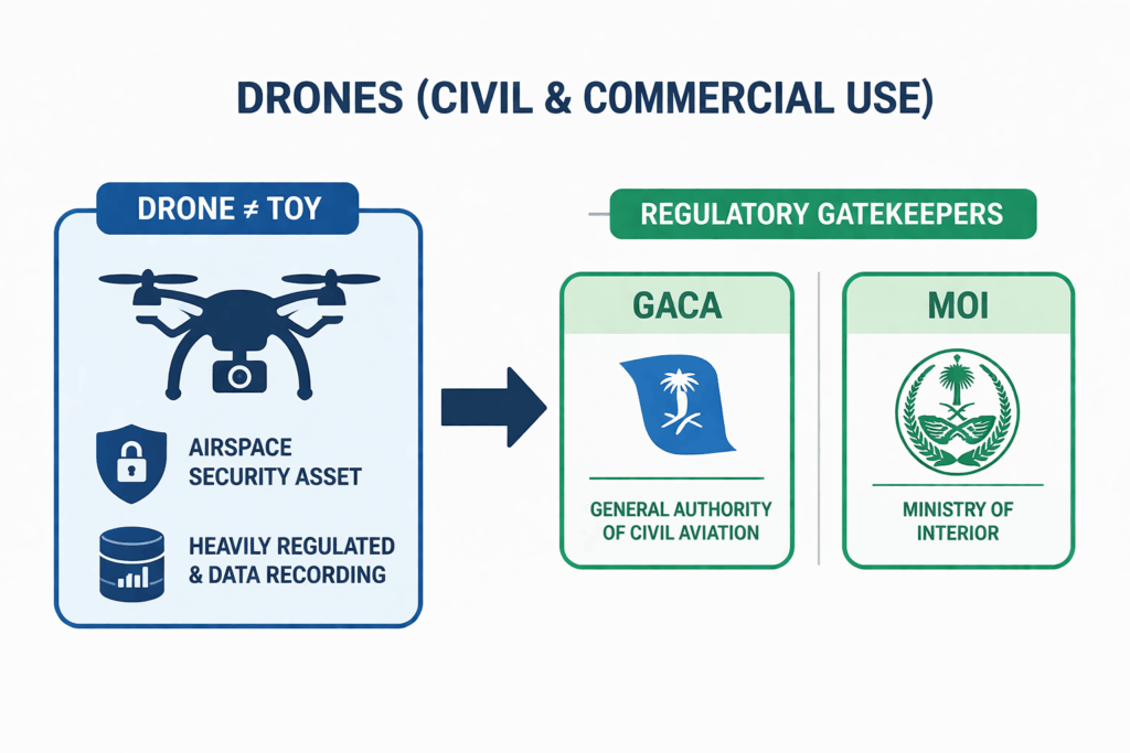 In Saudi Arabia, a drone is not viewed as a toy; it is treated as an airspace security asset. The Kingdom heavily regulates anything that flies and records data.